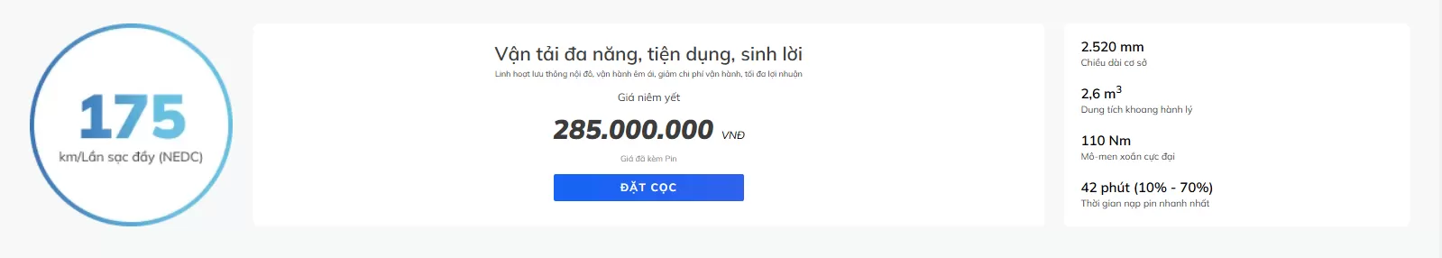 EC Van tiên phong mang đến giải pháp vận chuyển thương mại đột phá, nổi bật với khả năng vận hành linh hoạt, êm ái và tiết kiệm chi phí. Sở hữu thiết kế hiện đại, tiện dụng cùng bảng màu ngoại thất với 4 lựa chọn nổi bật: Xanh ngọc, vàng, trắng, đỏ. EC Van không chỉ là phương tiện di chuyển mà còn là đối tác tin cậy, phương tiện sinh kế phù hợp cho kinh tế hộ gia đình, doanh nghiệp