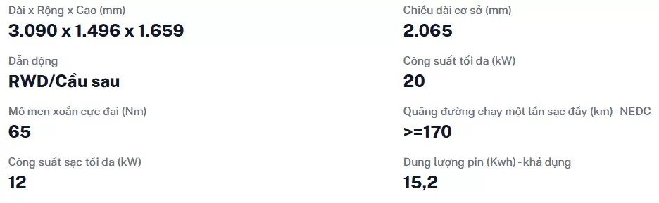 - Quãng đường 170km (tiêu chuẩn NEDC), tốc độ tối đa 80 km/h